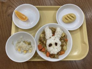今日の給食はウサギのカレー🍛おやつはスィートポテト🍠のお月見メニューでした!