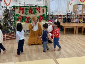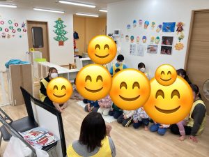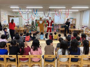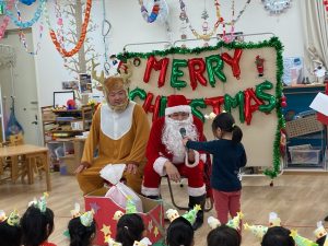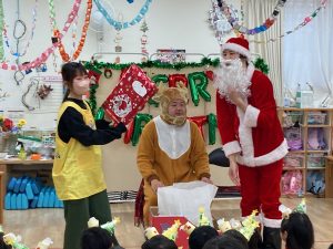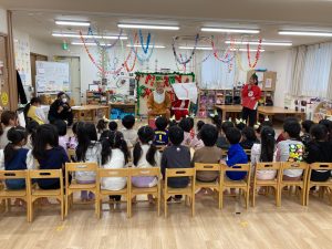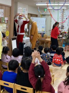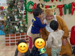 乳児さんはびっくりした様子のお友だちもいましたが少しすると慣れてきてサンタさんと触れ合ったり先生の質問を聞いたりしてサンタさんと仲良しに💗